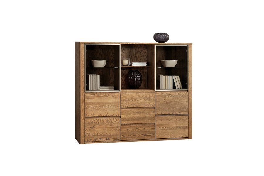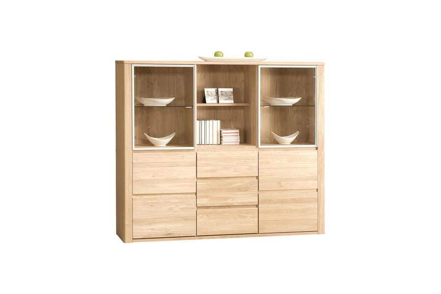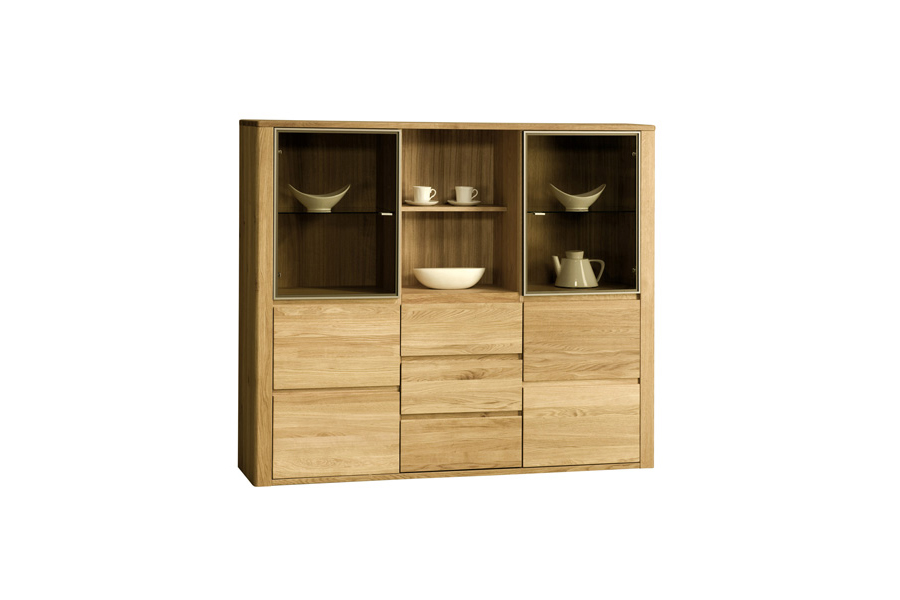 Komoda wysoka/Kredens posiada 2x drzwi przeszklone, 2x drzwi pełne oraz 3x szuflady. Możliwość zamówienia oświetlenia.
