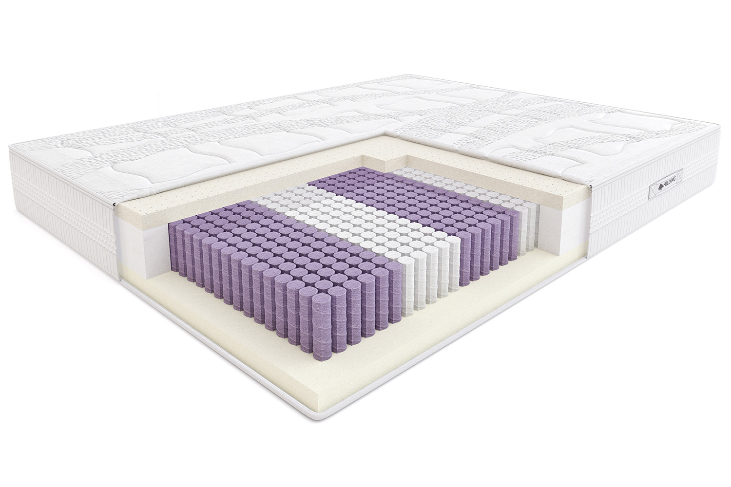 Wkład: 7-strefowa sprężyna kieszeniowa Multipocket, po jednej stronie pianka termoelastyczna Visco połączona z pianką Flexifoam o wys. 4,5 cm, po drugiej stronie blat lateksu o wys. 4,5 cm.