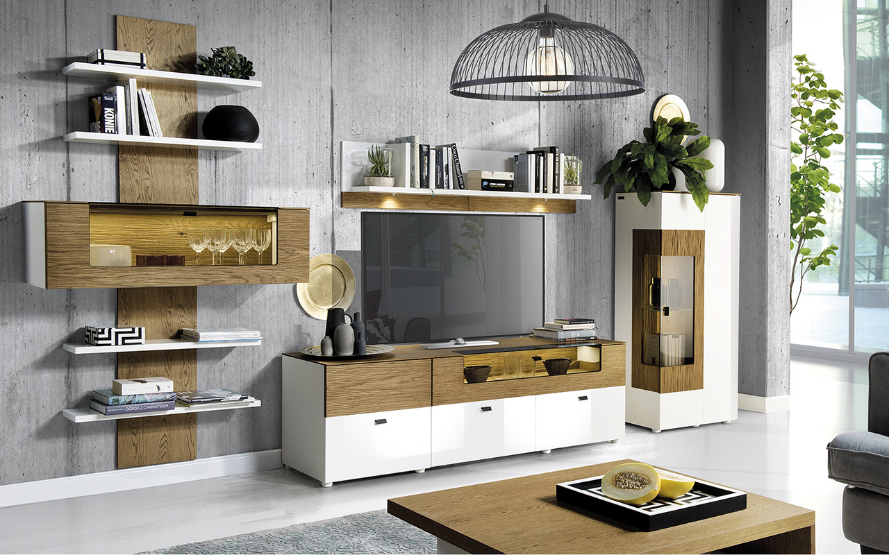 Konstrukcja: naturalna okleina dębowa, biały wysoki połysk, płyta meblowa,