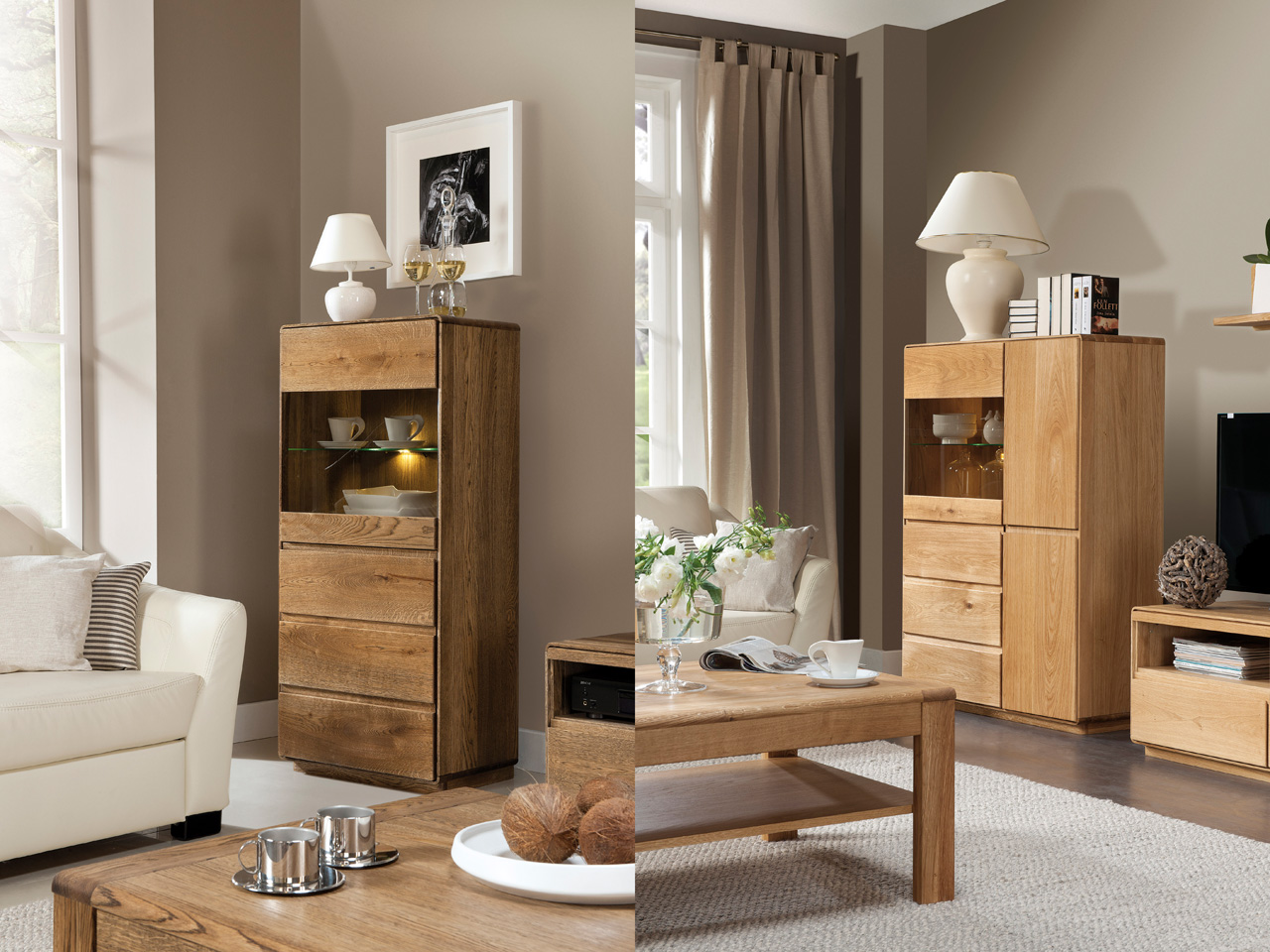 Program ATLANTA to minimalistyczna forma w skład kótergo wchodzą bryły, które pozwalają na umeblowanie m.in. jadalni, salonu, pokoju młodzieżowego, sypialni oraz gabinetu. Stonowany, zaokrąglony kształt korpusów, akcentowany jest wyrazistymi elementami, tworzy oryginalną, niepowtarzalną całość. Meble wykonane są z litego drewna dębowego z elementami z płyty w naturalne okleinie dębowej. Ich powierzchnia wykończono olejem i woskiem. Elementy drewniane są dodatkowo szczotkowane w celu uwypuklenia usłojenia.